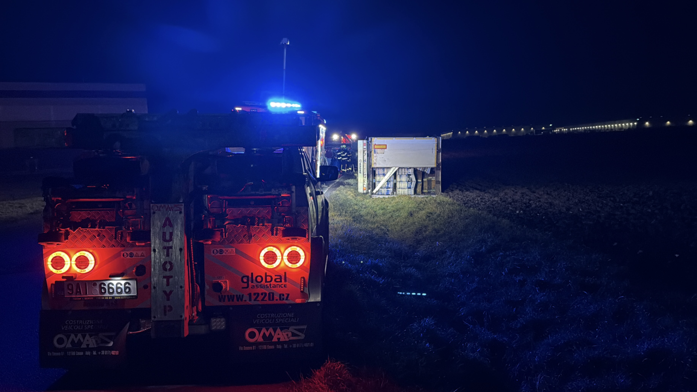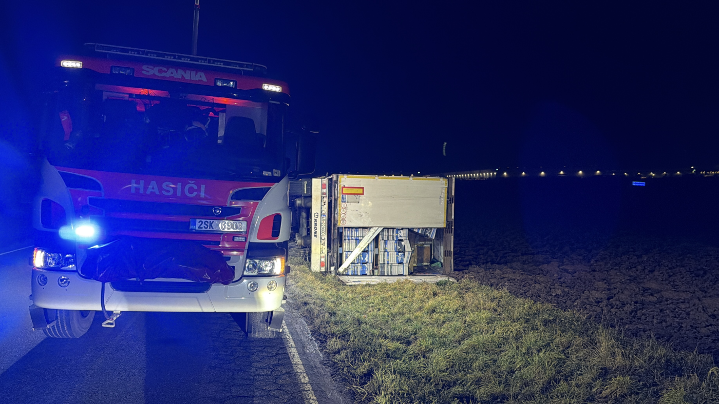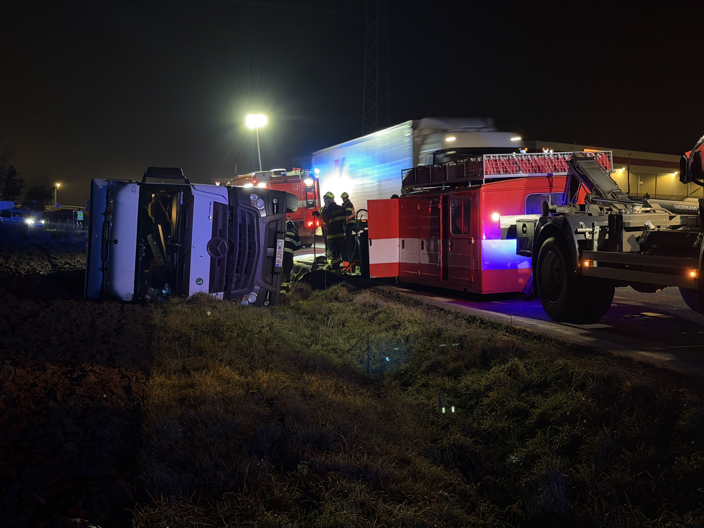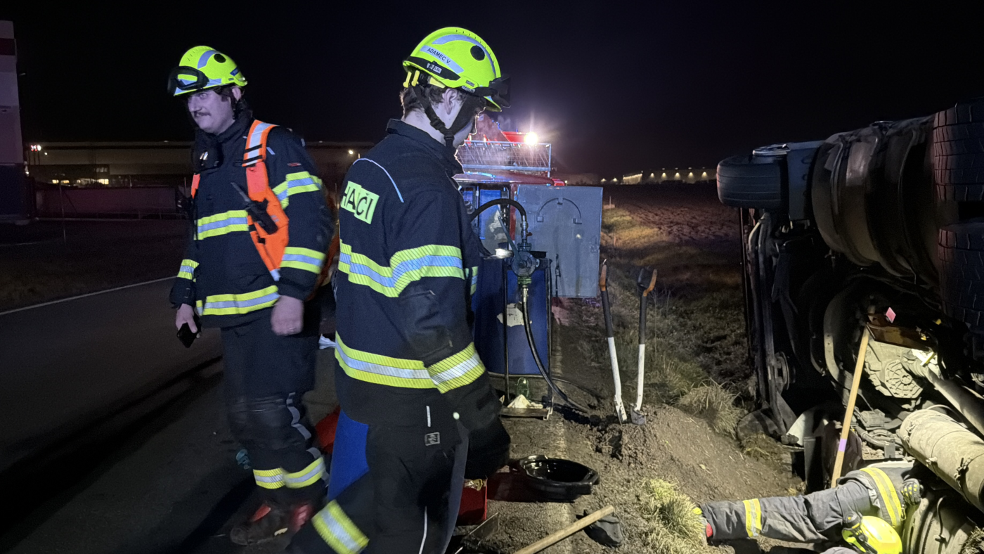 Hasiči ze Staré Boleslavi museli zasahovat u převráceného kamionu na Praze východ