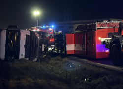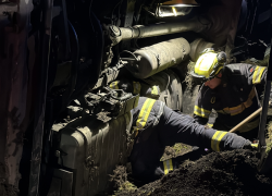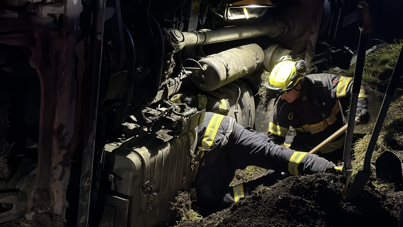 © AKTU.cz, Jiří Forman U Mstětic na Praze-východ došlo v úterý večer k vážně vypadající dopravní nehodě kamionu, která si vyžádala složitý zásah hasičů. Vozidlo se převrátilo na bok mimo komunikaci a z poškozené nádrže začala unikat nafta.