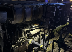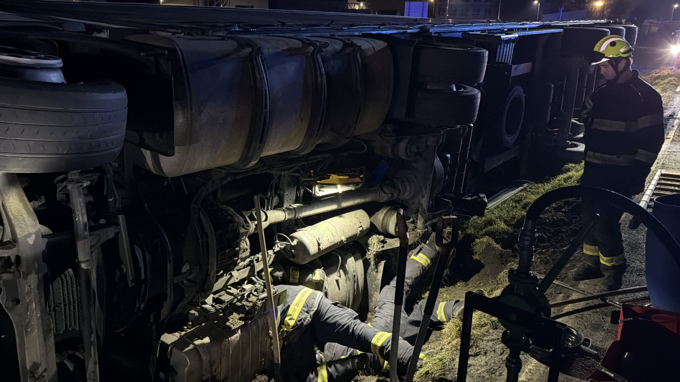 Krátce po půl sedmé byla kvůli nehodě uzavřena silnice vedoucí kolem obce, provoz musel být odkloněn a místo zabezpečili policisté. Kamion s rumunskou registrační značkou sjel podle všeho z vozovky poté, co se řidič plně nevěnoval řízení, zůstal stát nakloněný a následně se převrátil do příkopu.